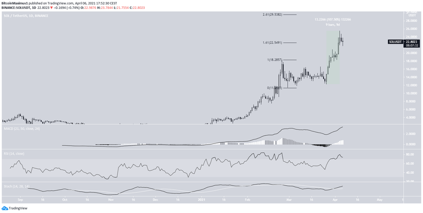 SOL đã tăng đáng kể kể từ ngày 26/03. Vào ngày 04/04, nó đạt mức giá cao nhất mọi thời đại là 25.53 USD. Vậy là trong 9 ngày, mức độ tăng trưởng của SOL đã tăng 107.5%.