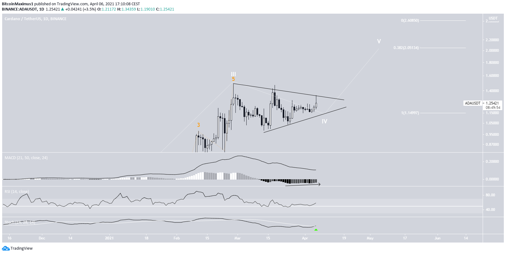 Kể từ khi đạt mức giá ATH mới vào ngày 27/02. ADA đã giao dịch bên trong một mô hình tam giác cân tăng giá.