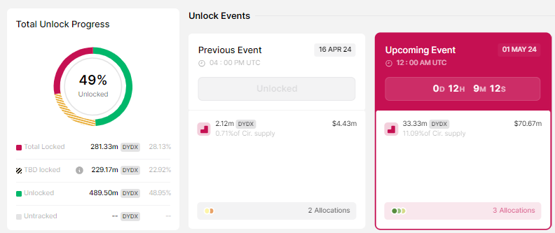 Tháng 5/2024 chứng kiến một sự kiện quan trọng trong lịch tiền điện tử với khoảng gần 4 tỷ USD lượng token được mở khóa từ nhiều dự án khác nhau. Việc mở khóa mã thông báo DYDX trị giá 70.67 triệu USD vào ngày 01/5 đặc biệt thú vị. Các mã thông báo mở khóa đại diện cho 10.7% nguồn cung lưu hành DYDX.