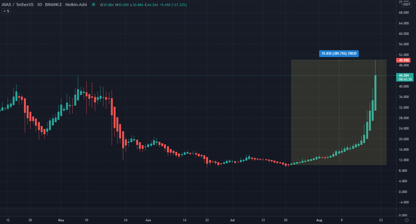 AVAX đã tăng hơn 30% vào thứ Bảy. Kể từ sau ngày 18 tháng 8, Avalanche Foundation công bố một chương trình khuyến khích khai thác thanh khoản trị giá 180 triệu USD có tên là “Avalanche Rush”. Giá trị của AVAX đã liên tục tăng.