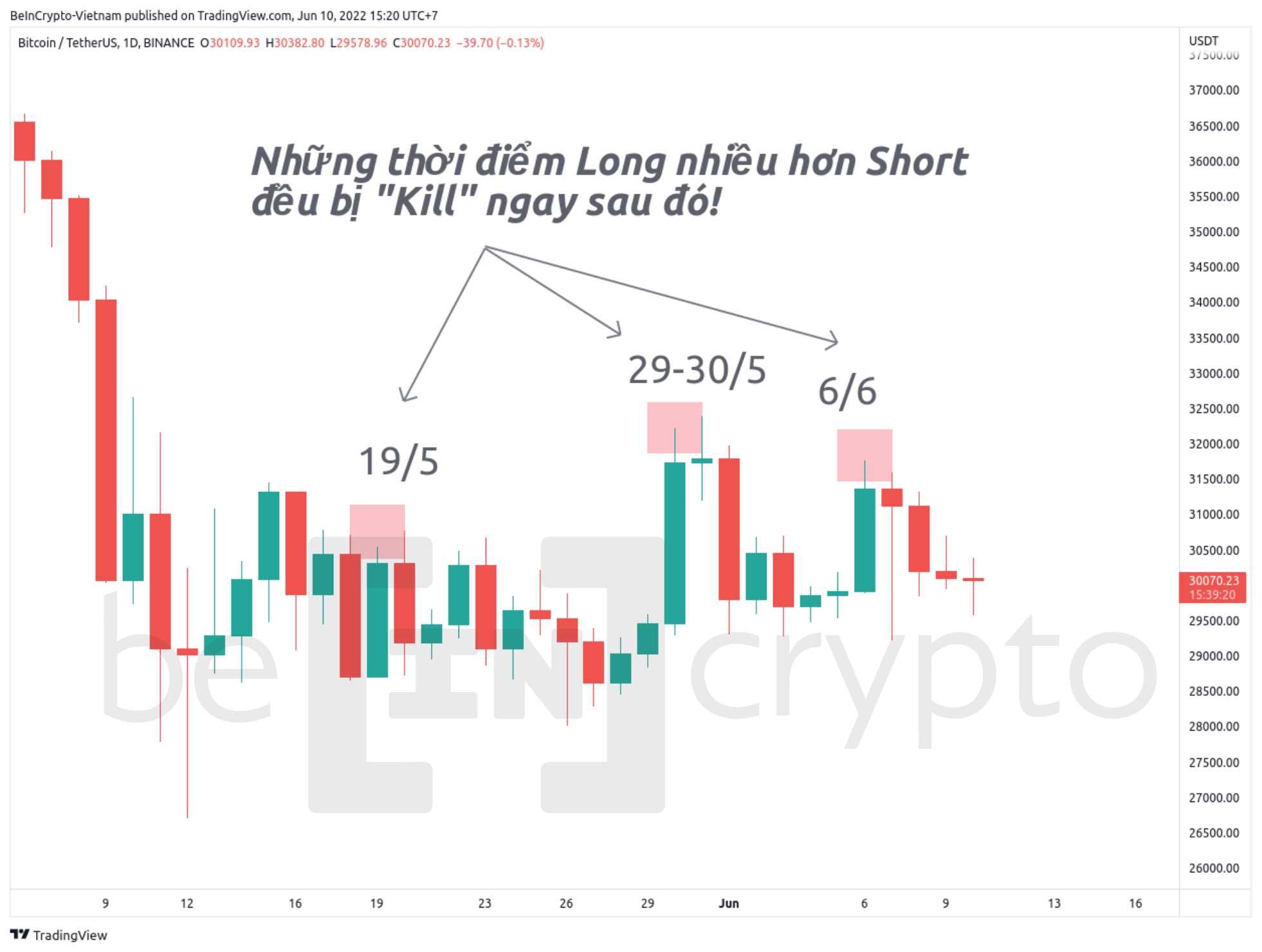 - Để ý tỷ lệ trên bạn sẽ nhận ra có một số ngày Long nhiều hơn Short, như 19/5, 29-30/5 và 6/6. Và tất cả những ngày trên giá Bitcoin đều sụt giảm ngay sau đó, khiến những lệnh Long lập tức bị thanh lý.