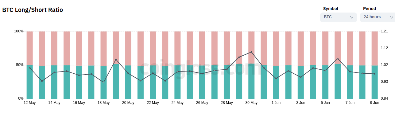Lượng Open Interest dù có giảm nhẹ đầu tháng 6, nhưng nhìn chung vẫn tăng mạnh từ đầu tháng 5 đến nay. Trong đó, phe Short thường xuyên áp đảo hơn phe Long.