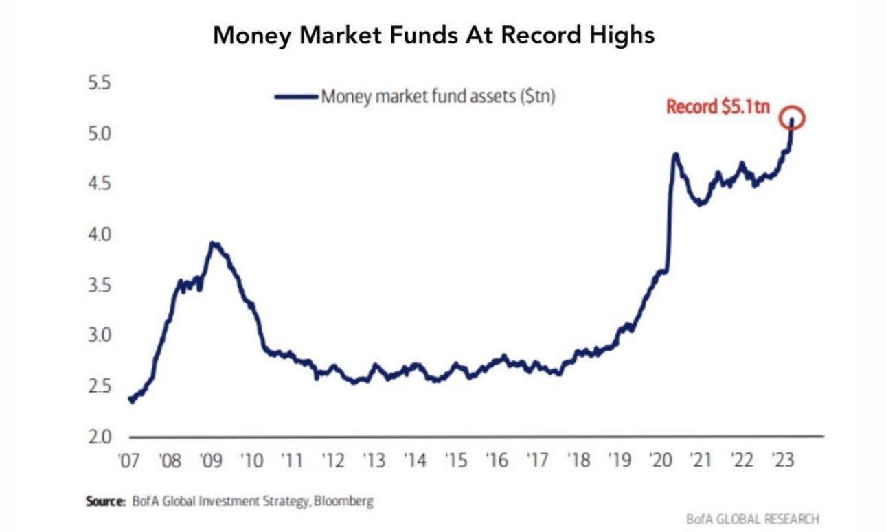 Biểu đồ sau cho thấy, tài sản trong các MMF trong đầu năm 2023 đã dựng đứng và lập ATH với 5.1 nghìn tỷ USD (trillion).