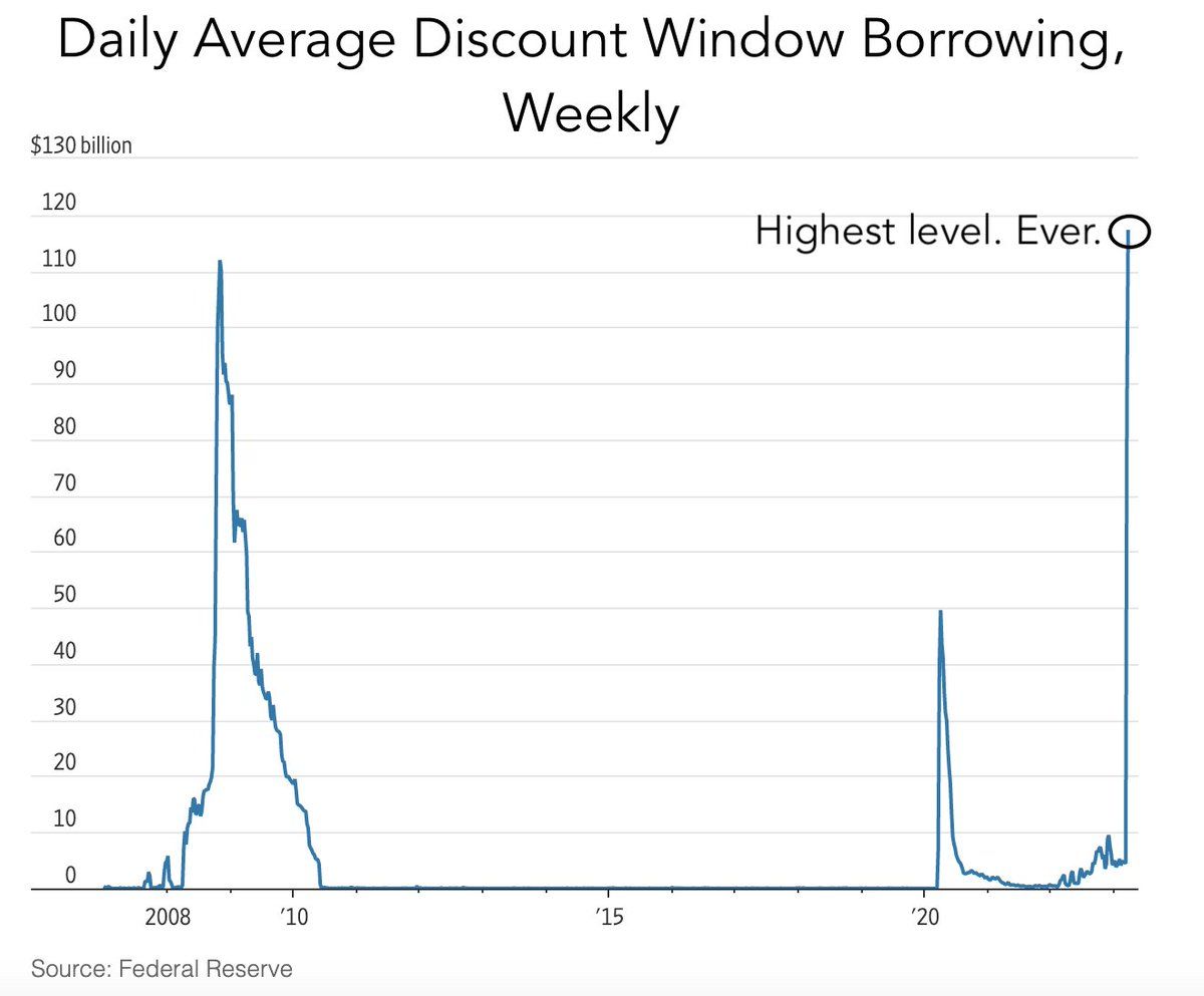 - 110 tỷ USD của 2008 có giá trị hơn rất nhiều so với ngày nay. Tuy nhiên, hãy để ý đến tốc độ vay. Tốc độ vay của năm 2023 là chưa từng có. Chỉ trong chưa đầy 1 tháng mà tiền từ cửa sổ chiết khấu đã gần chạm mức 120 tỷ USD. Điều này đặt ra cho chúng ta một dấu hỏi lớn về sức khỏe của các ngân hàng Hoa Kỳ.