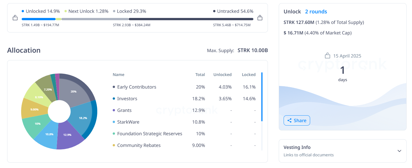 Vào ngày 15/04, 127.60 triệu token STRK sẽ được mở khóa, đại diện cho giá trị 16.71 triệu USD—khoảng 4.40% vốn hóa thị trường hiện tại. Trong số này, 66.92 triệu token (3.34%) được phân bổ cho những người đóng góp sớm, và 60.68 triệu token (3.34%) cho các nhà đầu tư.