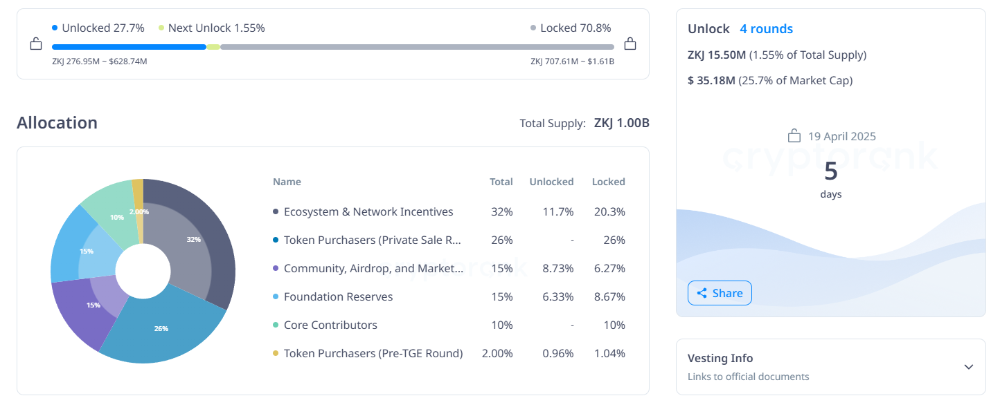 Đợt mở khóa ngày 19/04 bao gồm 15.50 triệu token ZKJ, trị giá 35.16 triệu USD—25.7% vốn hóa thị trường của ZKJ.