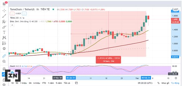 Vào tối hôm qua, TOMO cũng không ngoại lệ trong sự kiện đồng loạt nhiều Altcoin uptrend. Giá mở của thanh nến ngày là 1,06 USD và giá đóng là 1,80 USD. Ngoài ra, mức tạo đỉnh là 1,89 USD.