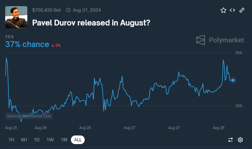 Vào ngày 27/08, Polymarket, một nền tảng dự đoán phổ biến, ước tính tỷ lệ chỉ 26% cho việc Durov được thả trước cuối tháng 8. Tuy nhiên, sau áp lực quốc tế và sự hỗ trợ từ các tổ chức như TON Society và Bộ Ngoại giao UAE, tỷ lệ này đã được cải thiện lên 37%.