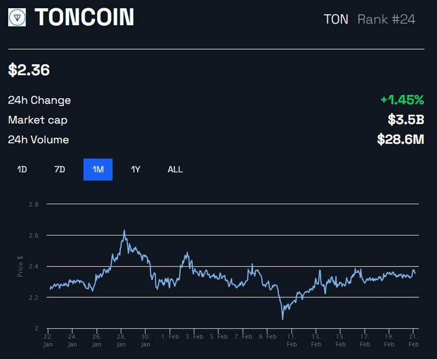 Toncoin đã chứng kiến mức tăng nhẹ 1% trong ngày để giao dịch ở mức 2.35 USD vào thời điểm BeInCrypto viết bài. Tuy nhiên, có rất ít biến động về giá TON trong tháng qua. Trên thực tế, TON chỉ tăng 8.3% kể từ đầu năm, trong khi một số tiền điện tử khác như Bitcoin và Altcoin đã tăng nhanh chóng kể từ đầu năm.