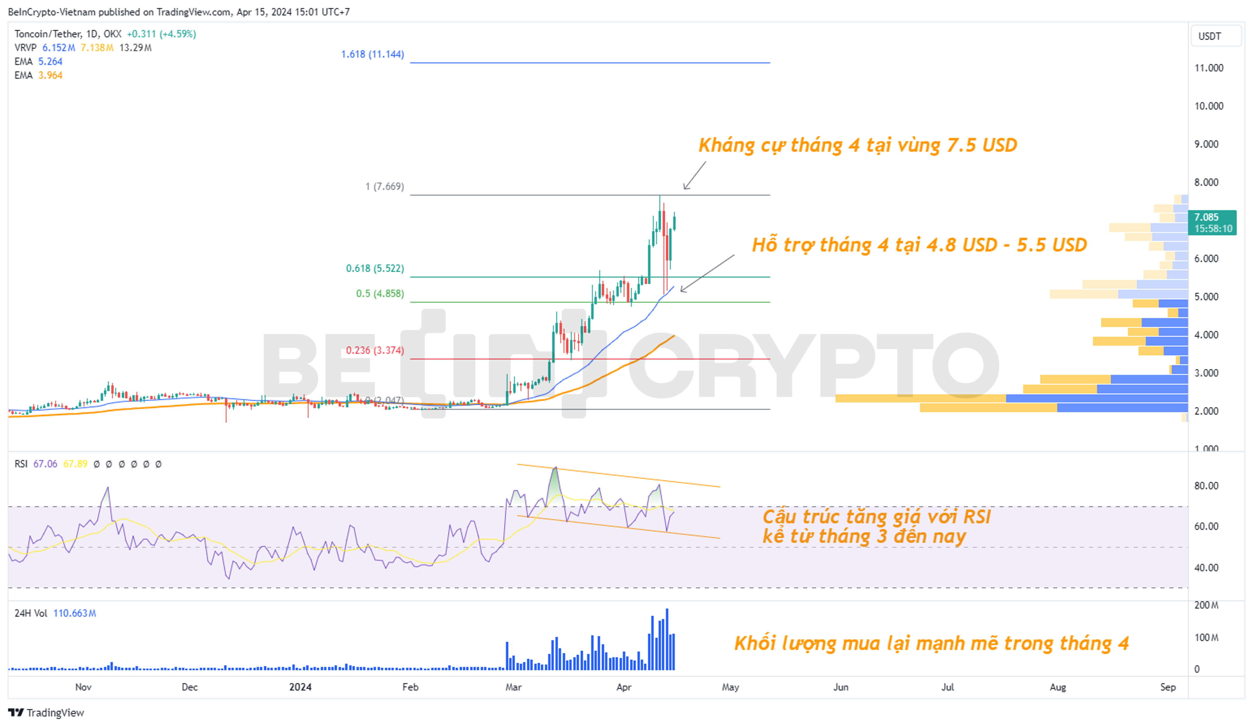 - Đà tăng mạnh của TON bắt đầu từ đầu tháng 3 đén nay và cấu trúc tăng này có thể được định hình bằng kênh song song của chỉ báo RSI khung ngày. Dù giá biến động lớn nhưng RSI cho phản ứng rất tốt với kênh song song này.