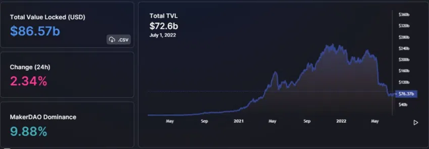 Tổng giá trị bị khóa (TVL) là cơ sở để đo lường hiệu suất của các ứng dụng phi tập trung (dApps). Vào ngày 2 tháng 12 năm 2021, TVL đạt mức cao nhất mọi thời đại là 253.91 tỷ USD.
