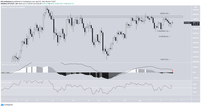 Ngày 6 tháng 4, BTC được ghi nhận đã giảm sau khi bị từ chối bởi vùng kháng cự 59,500 USD.