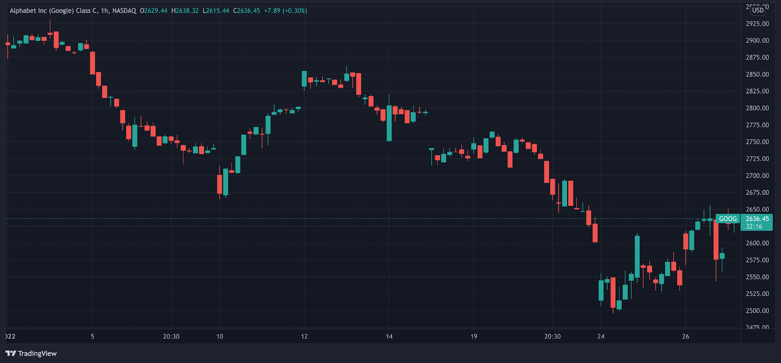 Tuy nhiên, kể từ đó, GOOG đã phục hồi một chút và hiện đang giao dịch quanh mức 2,640 USD.