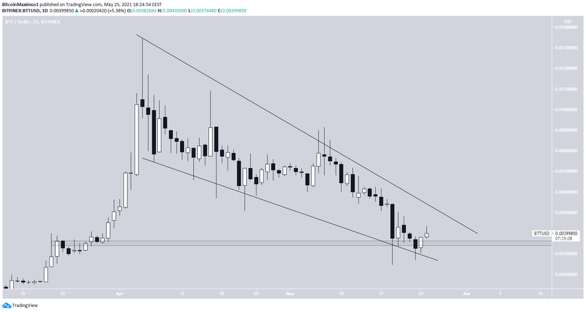 Kể từ khi đạt mức ATH vào ngày 5 tháng 4, giá của BTT đã giảm xuống. Bên trong mô hình cái nêm giảm dần.