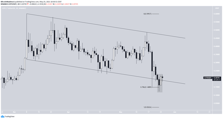 COTI được giao dịch bên trong một kênh song song giảm dần kể từ ngày 1 tháng 3. Vào ngày 23 tháng 5, tiền điện tử của Coti đã bật lên ngay dưới đường hỗ trợ của kênh. Ngay tại mức Fibo hỗ trợ thoái lui 0.786.