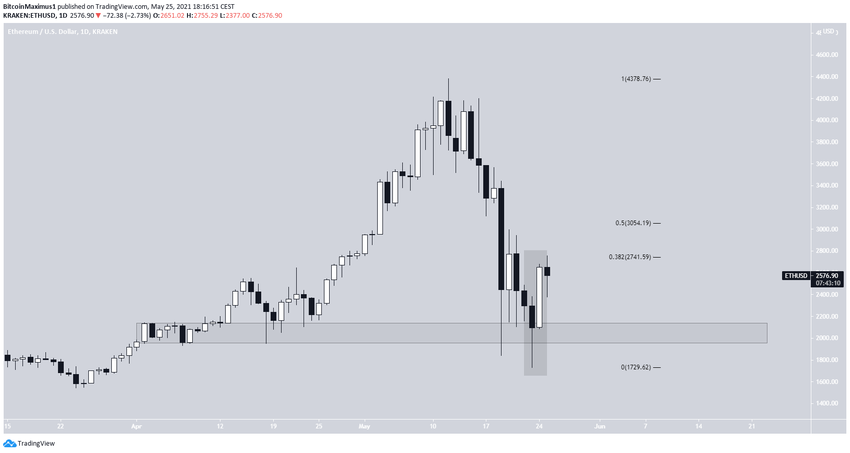 ETH đã giảm kể từ khi chạm mốc ATH vào ngày 12 tháng 5. Tuy nhiên, giá đã bật lên tại vùng hỗ trợ 2,050 USD vào ngày 23 tháng 5. Và vào ngày hôm sau, giá của tiền điện tử đã tạo ra một thanh nến chìm tăng giá.