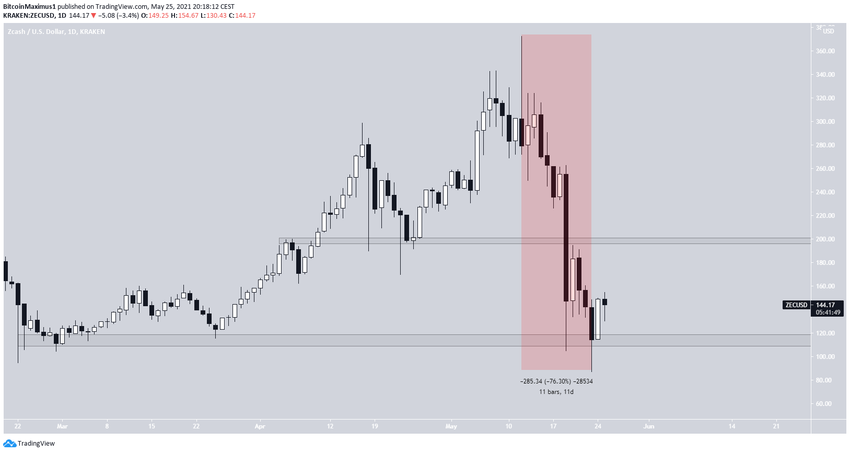 ZEC bắt đầu giảm vào ngày 12 tháng 5 và tiếp tục xu hướng giảm trong 11 ngày sau đó. lúc này, giá trị của ZEC đã giảm tổng cộng 76.30%. Vào ngày 23 tháng 5, ZEC được ghi nhận đạt mức thấp nhất là 87.38 USD.
