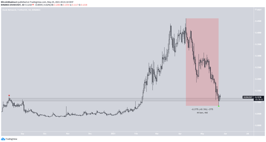 Kể từ ngày 9 tháng 4, sau khi giá của DUSK đạt được mức cao là 0.46 USD thì nó bắt đầu giảm xuống. Xu hướng giảm diễn ra liên tục trong 44 ngày.