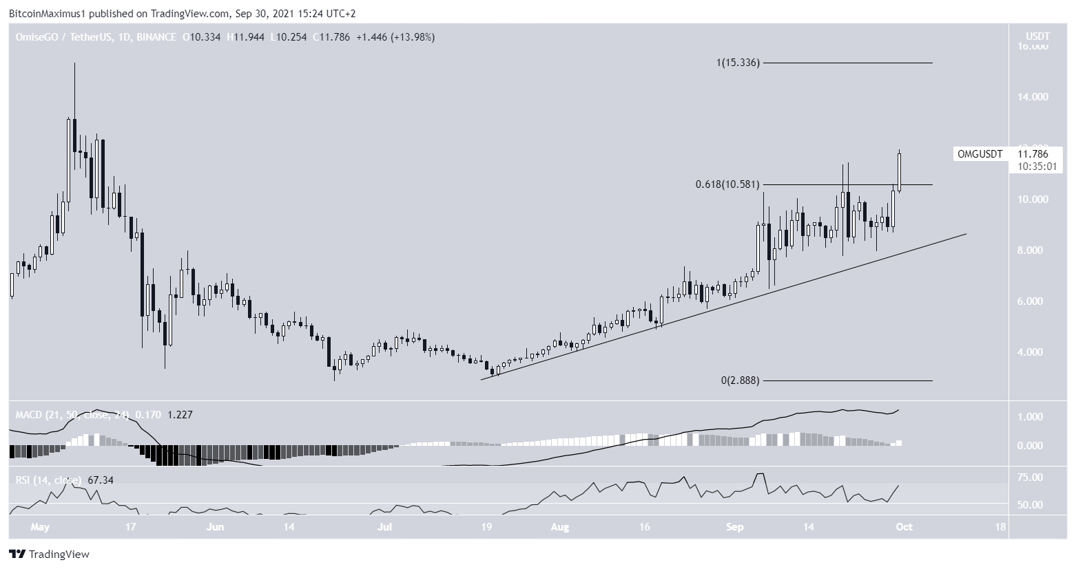 OMG đã tăng cùng với đường hỗ trợ tăng dần kể từ ngày 20 tháng 7. Vào ngày 6 tháng 9, đồng altcoin này đạt mức cao là 10.30 USD nhưng không thể vượt ra trên mức kháng cự 0.618 Fib thoái lui tại 10.60 USD.