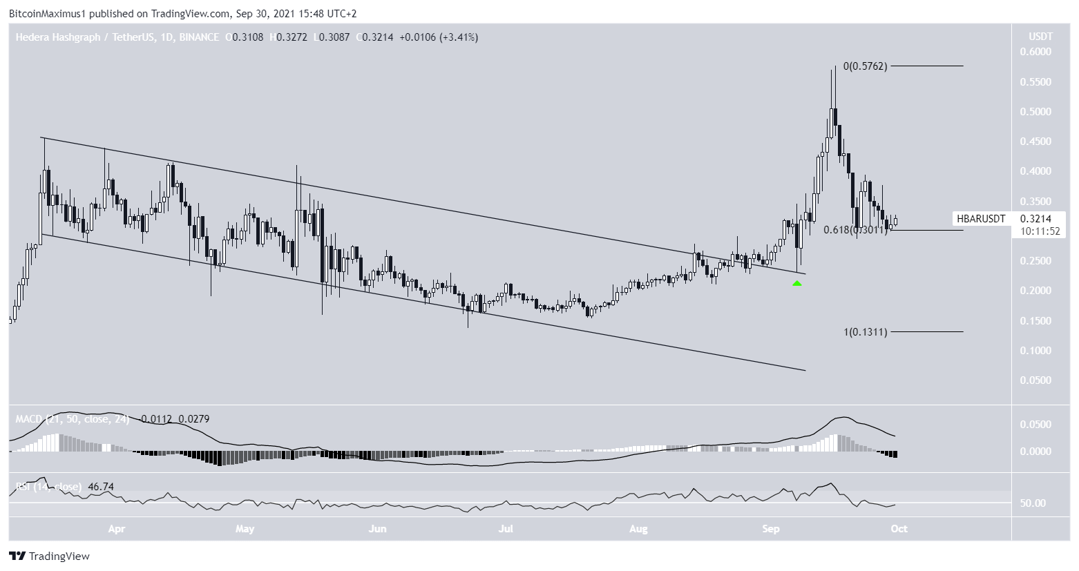 HBAR hiện đã bật lên ở mức hỗ trợ 0.618 Fib thoái lui ở mức 0.30 USD và có khả năng bắt đầu một xu hướng tăng trong ngắn hạn.