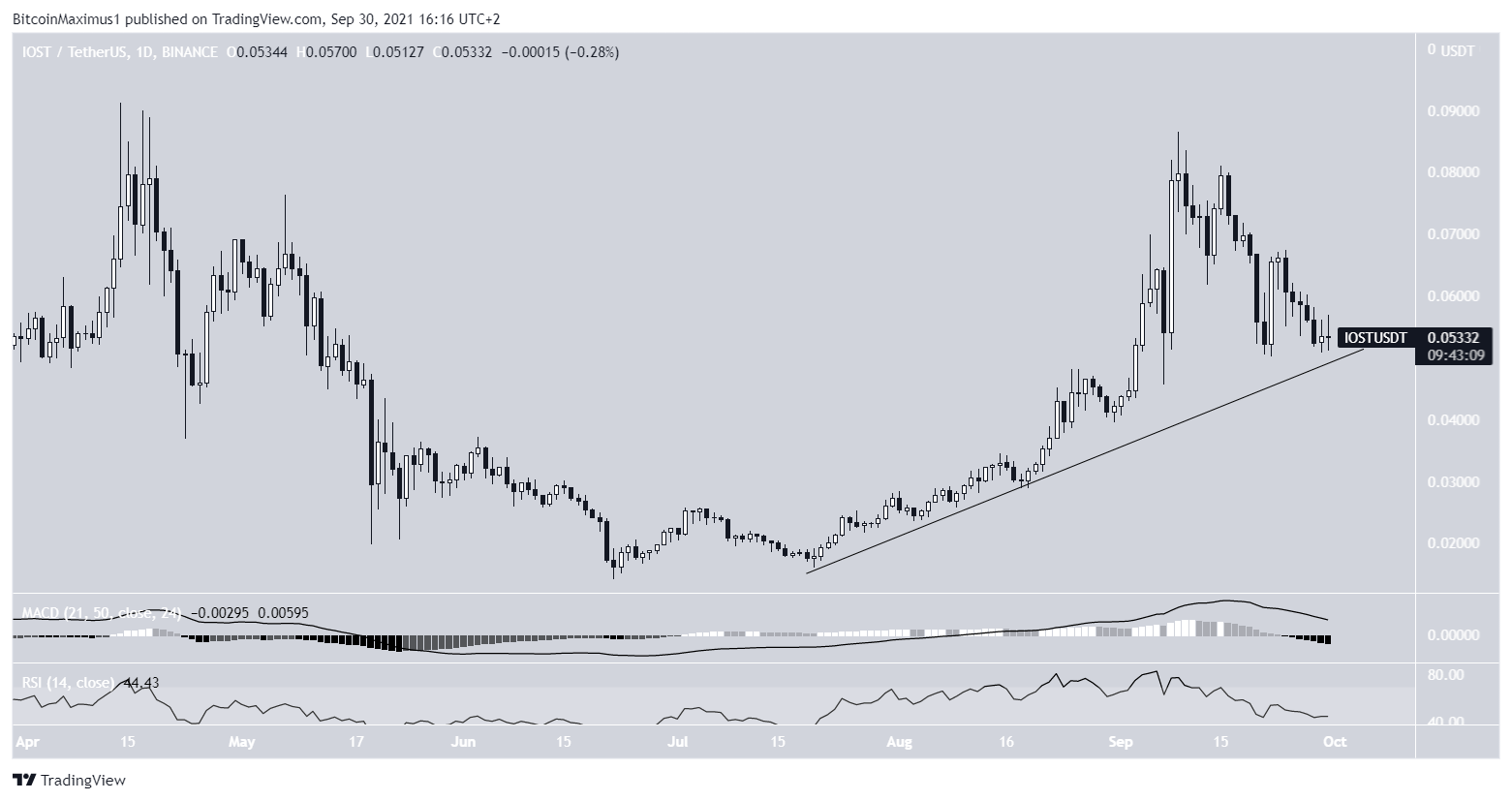 IOST đã tăng cùng với đường hỗ trợ tăng dần kể từ ngày 20 tháng 7. Trong đà tăng này, IOST đã đạt được mức cao nhất tại 0.087 USD vào ngày 9 tháng 9.