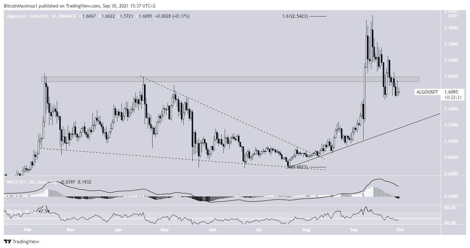 Vào ngày 13 tháng 9, giá ALGO đạt mức đỉnh lịch sử mới tại 2.55 USD. Mức đỉnh này được thực hiện ngay trên mức kháng cự 1.61 Fib thoái lui bên ngoài. Kể từ đó, đồng altcoin này đã di chuyển xuống dưới và đã giảm xuống dưới khu vực ngang 1.80 USD.