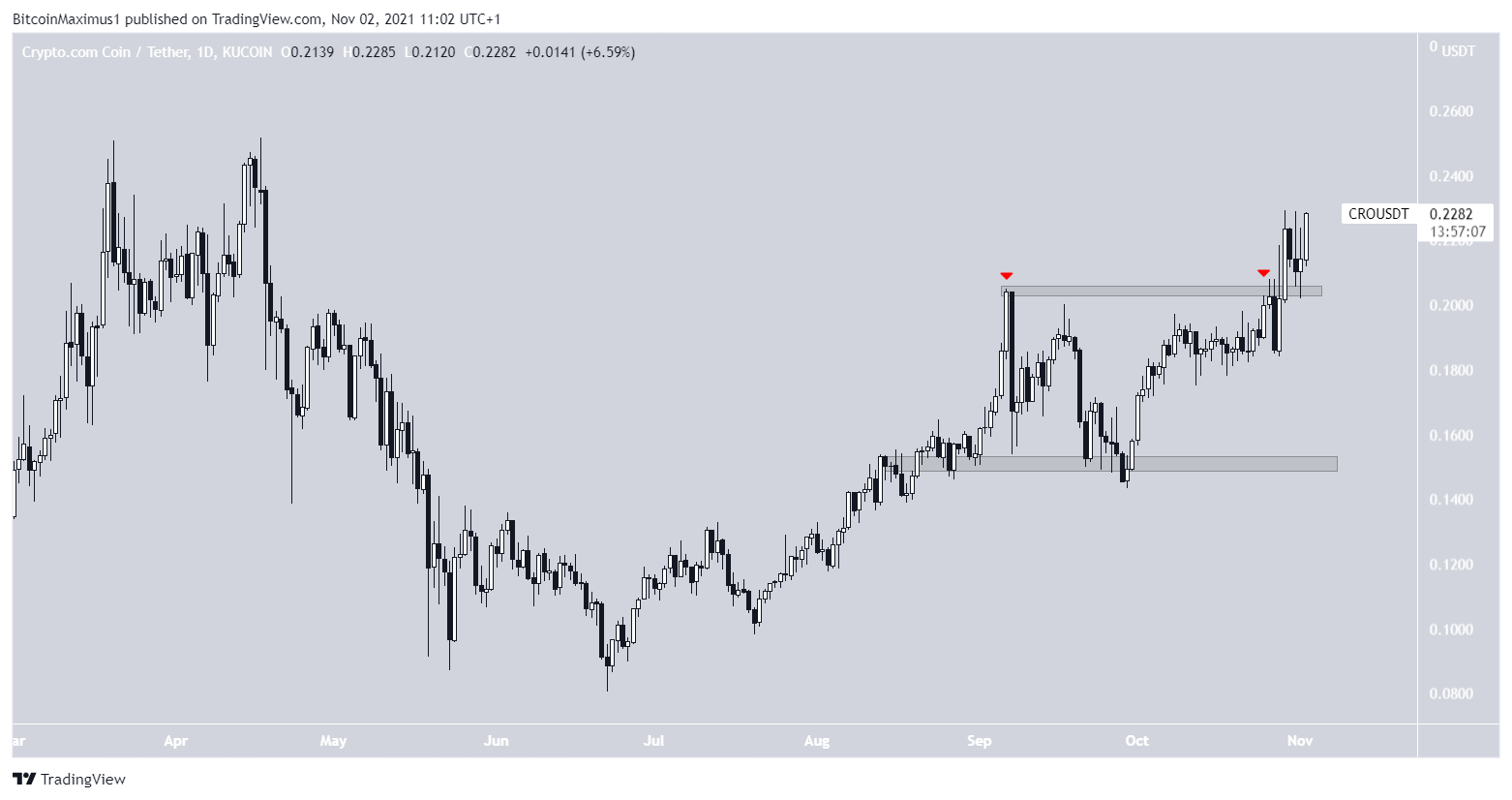 CRO có khả năng tạo ra một mô hình hai đỉnh ở mức 20 USD. Đây được coi là một mô hình giảm giá thường dẫn đến sự đảo chiều của giá. Tuy nhiên, CRO đã lấy lại vị thế của nó sau đó và vượt qua vùng kháng cự 0.225 USD.