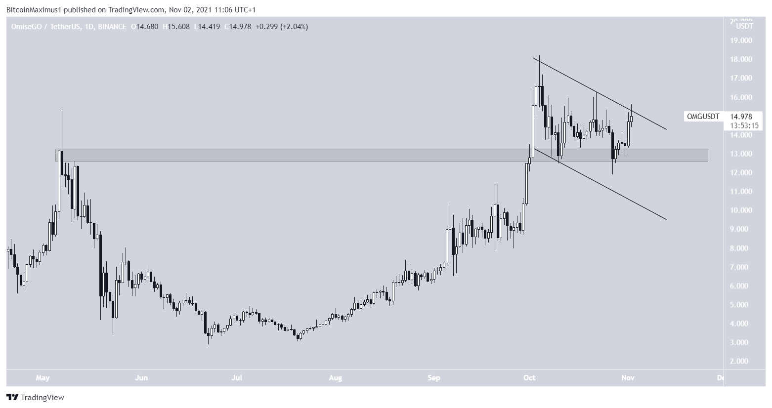 Giá OMG đã giảm kể từ khi đạt mức đỉnh lịch sử vào ngày 4 tháng 10. Mức giảm có thể mang hình dạng của một kênh song song giảm dần. Hiện tại, OMG đang trong quá trình bứt phá khỏi kênh song song giảm dần.