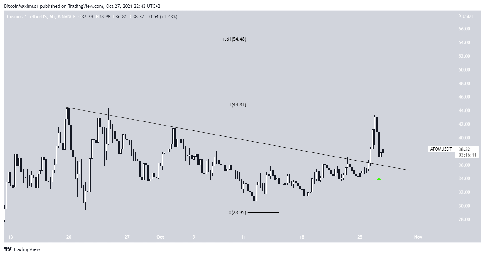 ATOM đã thoát ra khỏi một đường kháng cự giảm dần đã được hình thành kể từ đỉnh vào ngày 20 tháng 9. Vào ngày 25 tháng 10, ATOM đã xác nhận nó là hỗ trợ (biểu tượng màu xanh lá cây).