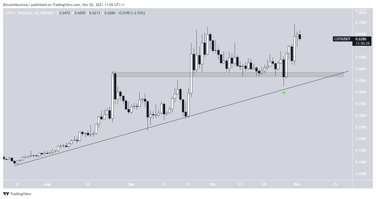 Tuy nhiên, COTI đang duy trì mức giá trên vùng hỗ trợ ngang 0.48 USD và một đường hỗ trợ tăng dần kể từ tháng Bảy. Nó bắt đầu tăng vào ngày 27 tháng 10 và đà tăng vẫn đang tiếp tục.