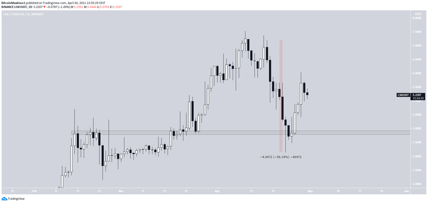 Kể từ 17 tháng 4, LSK bắt đầu giảm mạnh khi chỉ trong 6 ngày, nó đã mất 56% giá trị. Tuy nhiên, nó đã bật lên ở khu vực 3.80 USD. Sau khi xác nhận vùng đó là hỗ trợ, giá đã bắt đầu đi lên.