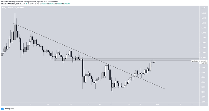 Kể từ sau khi bật lên vào ngày 23 tháng 4, ANT đã tăng lên đáng kể. Nó hiện đã thoát ra khỏi đường kháng cự giảm dần. Tuy nhiên, ANT vẫn chưa thể lấy lại vùng kháng cự 10.30 USD.