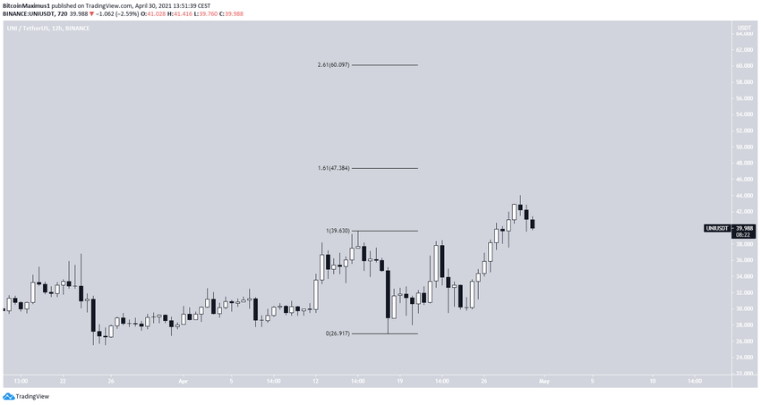 Vào ngày 29 tháng 4, UNI đã chạm mốc ATH mới với 44 USD. Nó hiện đang kiểm tra lại để xác nhận vùng kháng cự trước đó là hỗ trợ. Các mức kháng cự tiếp theo sẽ được tìm thấy lần lượt là 47.4 USD và 60 USD.