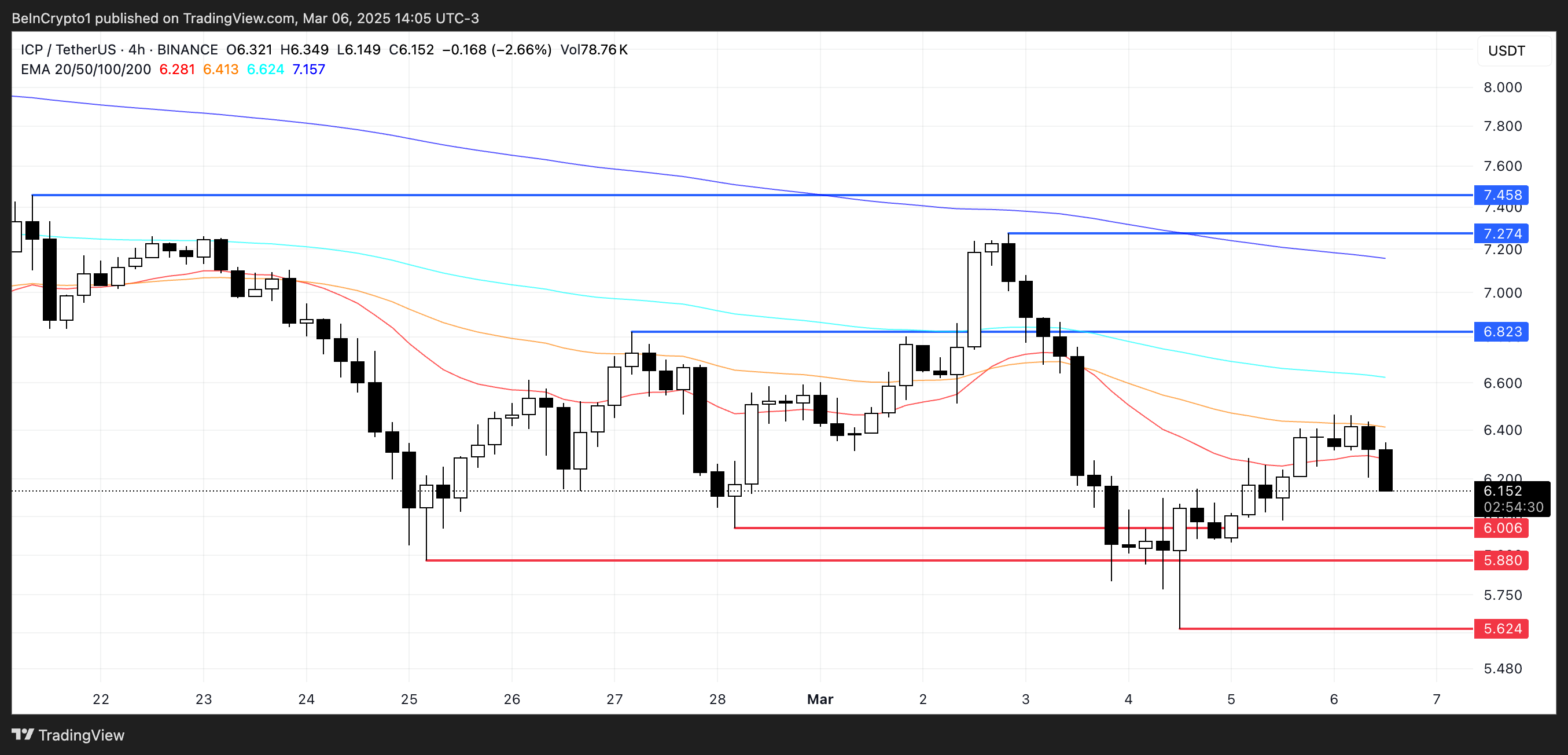ICP đã giảm hơn 13% trong 30 ngày qua, với vốn hóa thị trường hiện dưới 3 tỷ USD. Nếu xu hướng giảm hiện tại tiếp tục, ICP có thể kiểm tra mức hỗ trợ tại 6 USD, và nếu phá vỡ dưới mức đó có thể đẩy nó xuống 5.88 USD, với một đợt bán mạnh hơn có thể dẫn đến 5.62 USD.
