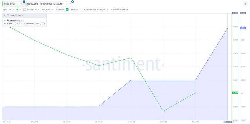 Vào ngày 30/6, sau nhiều nỗ lực vào tháng 2 và tháng 4, Litecoin cuối cùng đã vượt qua ngưỡng kháng cự 105 USD để đạt mức đỉnh mới vào năm 2023 là 108 USD. Tuy nhiên, một nhóm cụ thể gồm những cá voi tiền điện tử nắm giữ số dư từ 1 triệu LTC đến 10 triệu đồng LTC hiện đang cố gắng kiếm thêm lợi nhuận.