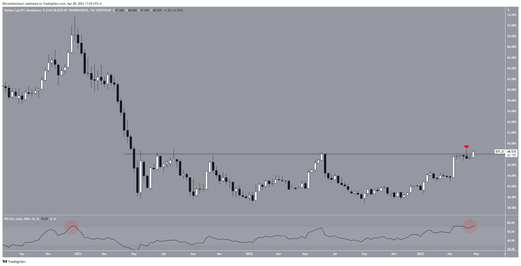 Tỷ lệ thống trị Bitcoin (BTCD) cho thấy mối quan hệ giữa vốn hóa thị trường của Bitcoin và phần còn lại của thị trường tiền điện tử. Tại thời điểm viết bài, giá trị BTCD là 48.50% có nghĩa là 48.50% toàn bộ vốn hóa thị trường tiền điện tử đến từ Bitcoin.