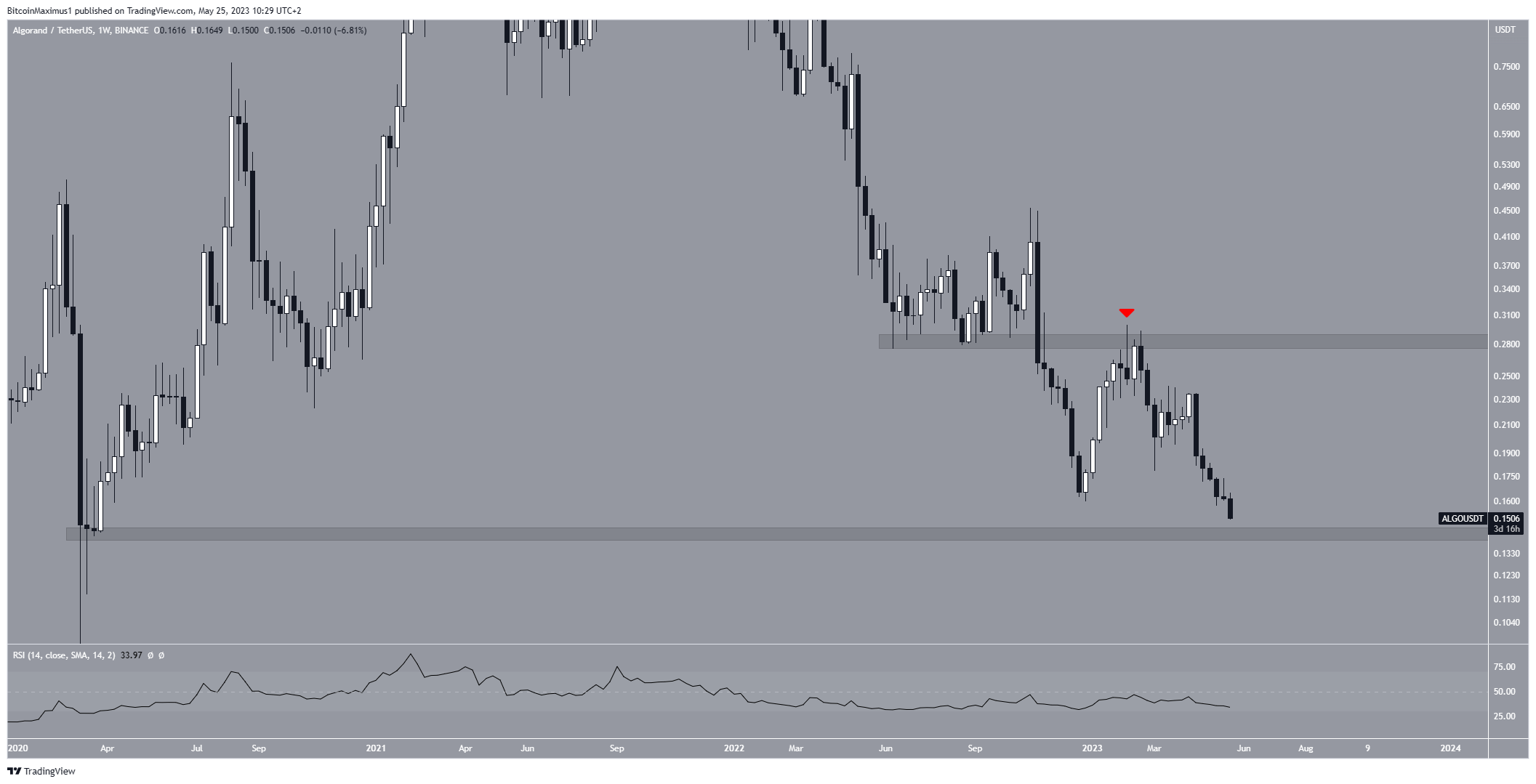 Giá ALGO đã bắt đầu phục hồi vào đầu năm nhưng không vượt qua được vùng kháng cự 0.28 USD. Khiến giá bắt đầu giảm mạnh (biểu tượng màu đỏ). Đợt sụt giảm đã dẫn đến mức đáy mới của năm là 0.15 USD, được tạo vào tháng 5