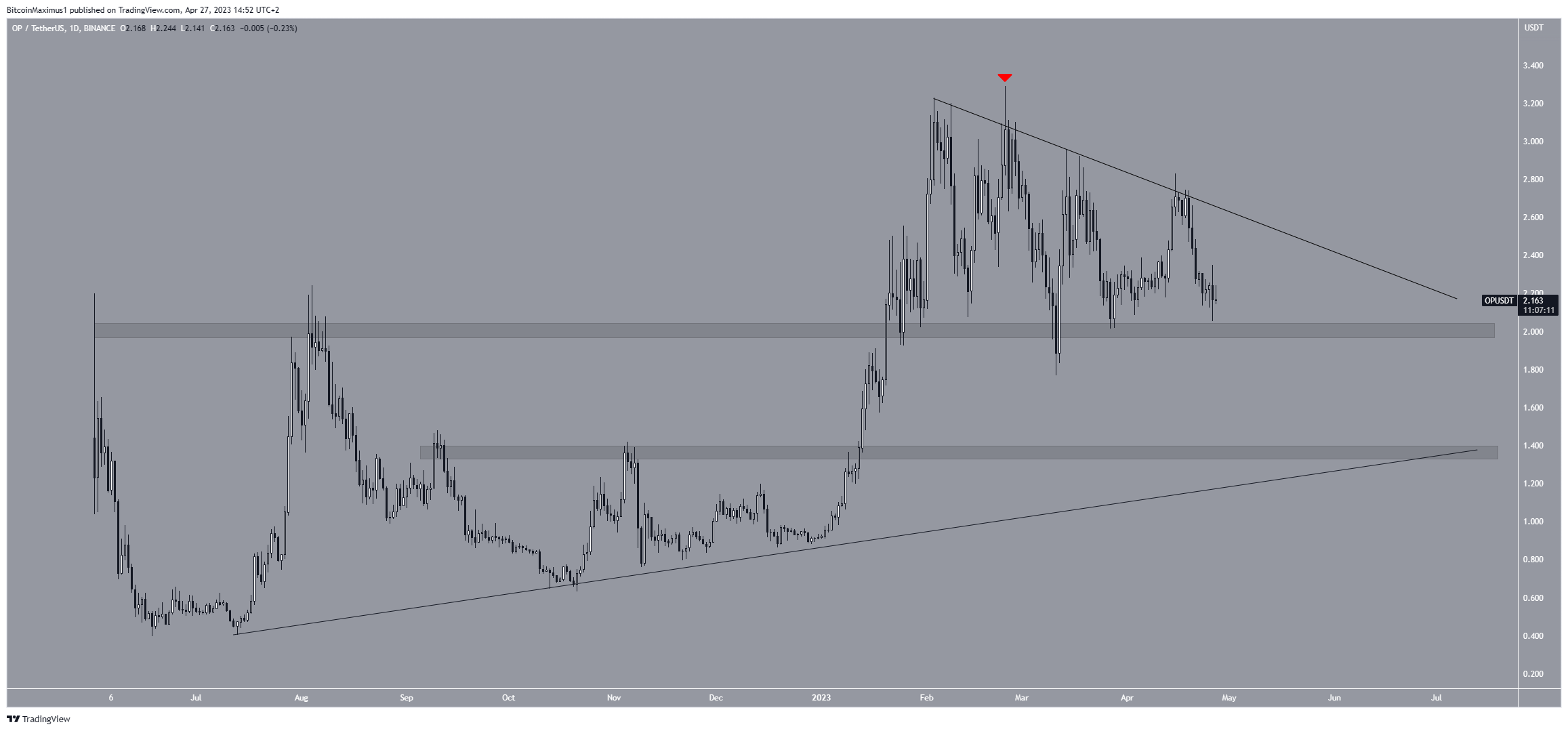 Giá OP đã giảm xuống dưới đường kháng cự giảm dần kể từ đầu tháng 2. Bên cạnh đường này, giá cũng đã phản ứng với vùng hỗ trợ ngang 2.0 USD.
