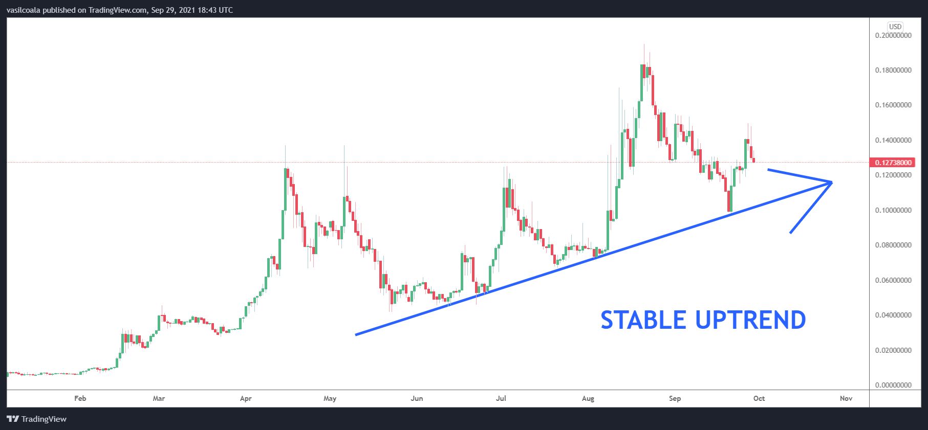 Đứng vị trí đầu tiền trong danh sách altcoin hàng đầu cho tháng 10 của chúng tôi là LUNA. LUNA cũng lọt vào danh sách altcoin hàng đầu của tháng trước và trong tháng này đồng altcoin này đã vươn lên vị trí Top 1 trong danh sách vì sự gia tăng vị trí trong bảng xếp hạng vốn hóa thị trường của nó. Với hơn 13 tỷ USD, LUNA hiện là tiền điện tử lớn thứ 14 về vốn hóa thị trường và chúng tôi nghĩ rằng nó có thể tiếp tục tăng cao hơn nữa.