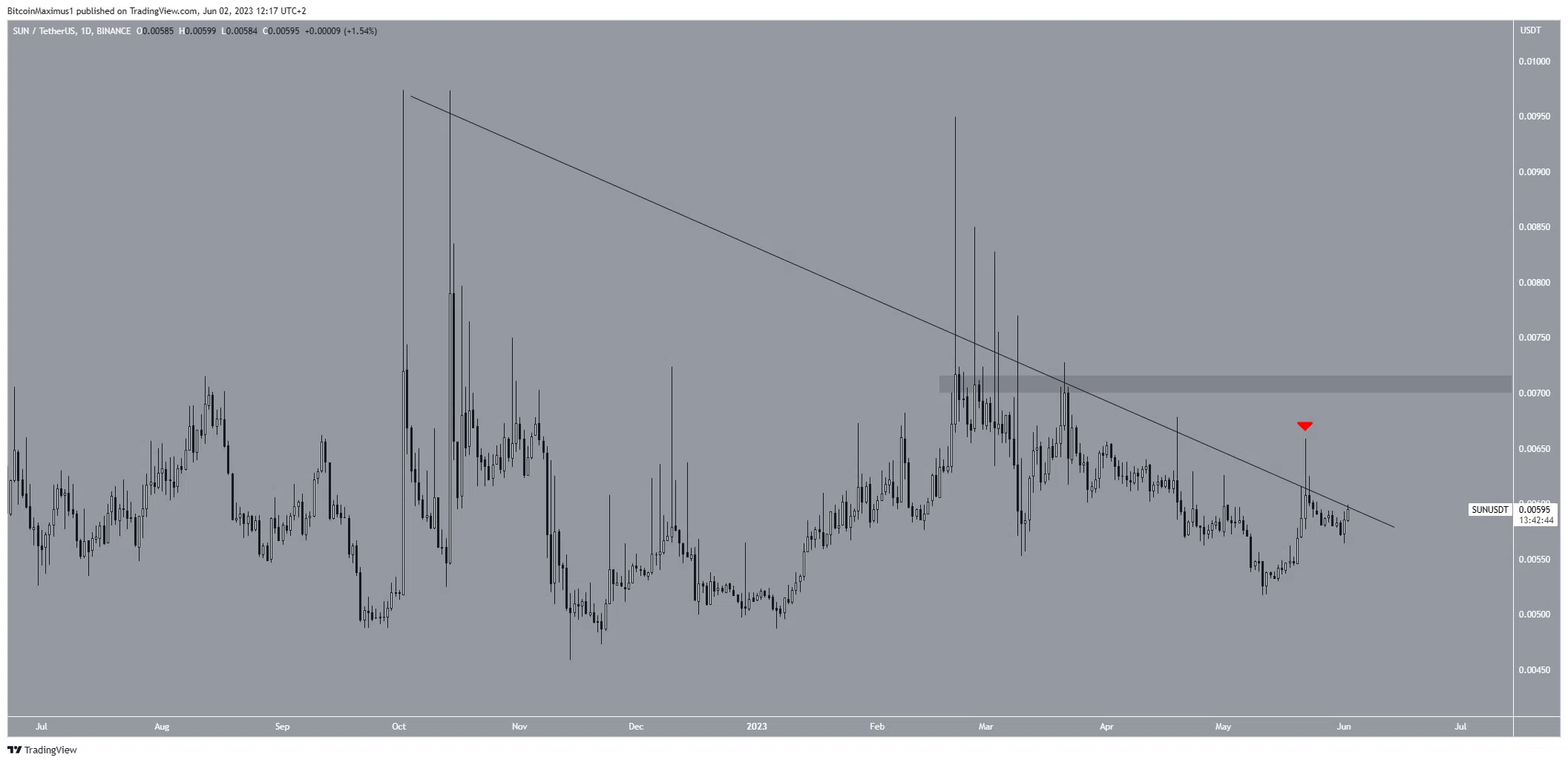 Giá SUN đã giảm xuống dưới đường kháng cự giảm dần kể từ tháng 10 năm 2022. Altcoin đã nhiều lần thất bại trong việc vượt đường kháng cự này, lần gần đây nhất là vào ngày 22 tháng 5 năm 2023 (biểu tượng màu đỏ). Tuy nhiên, giá SUN đang cố gắng bứt phá một lần nữa.