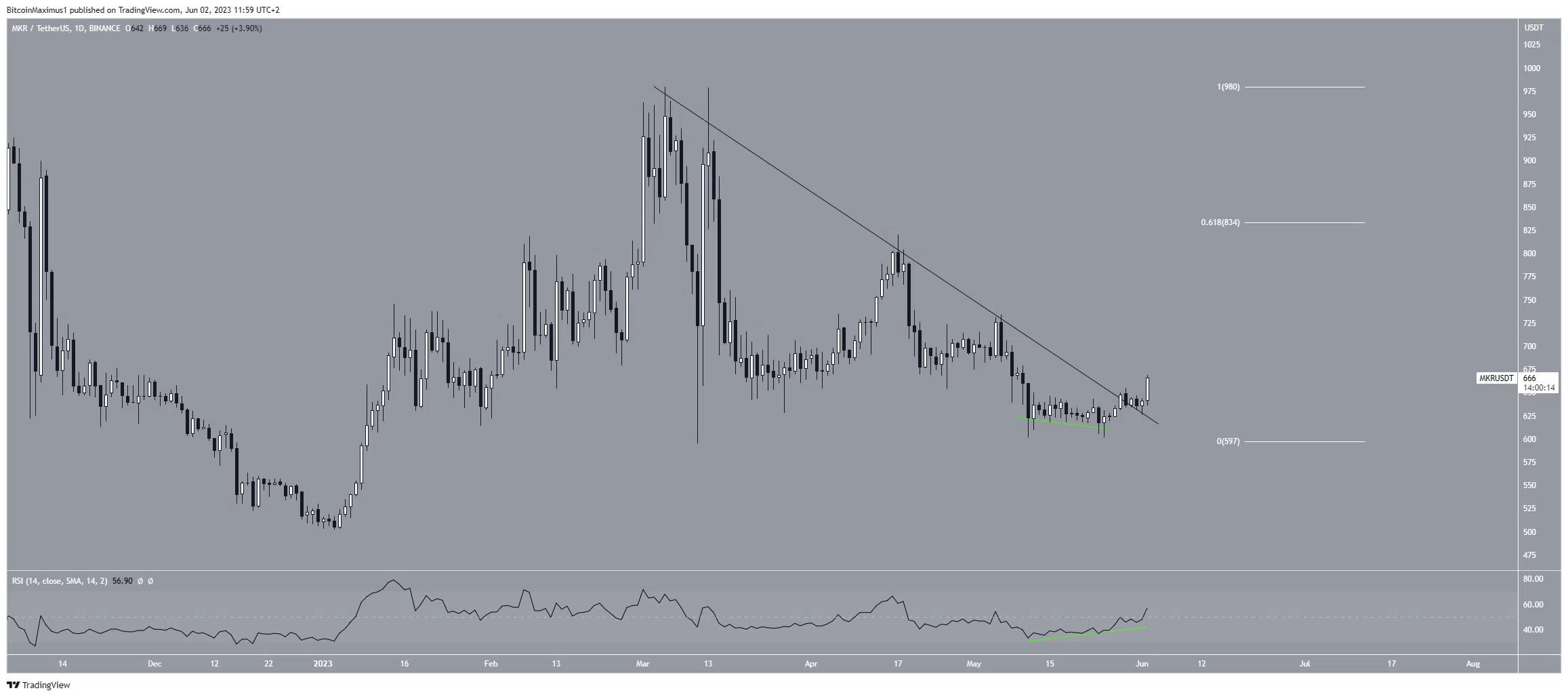 Giá MKR đã giảm xuống dưới đường kháng cự giảm dần kể từ đầu tháng Ba. Đợt sụt giảm đã khiến altcoin này chạm đáy ở mức 600 USD vào tháng 5 năm 2023.