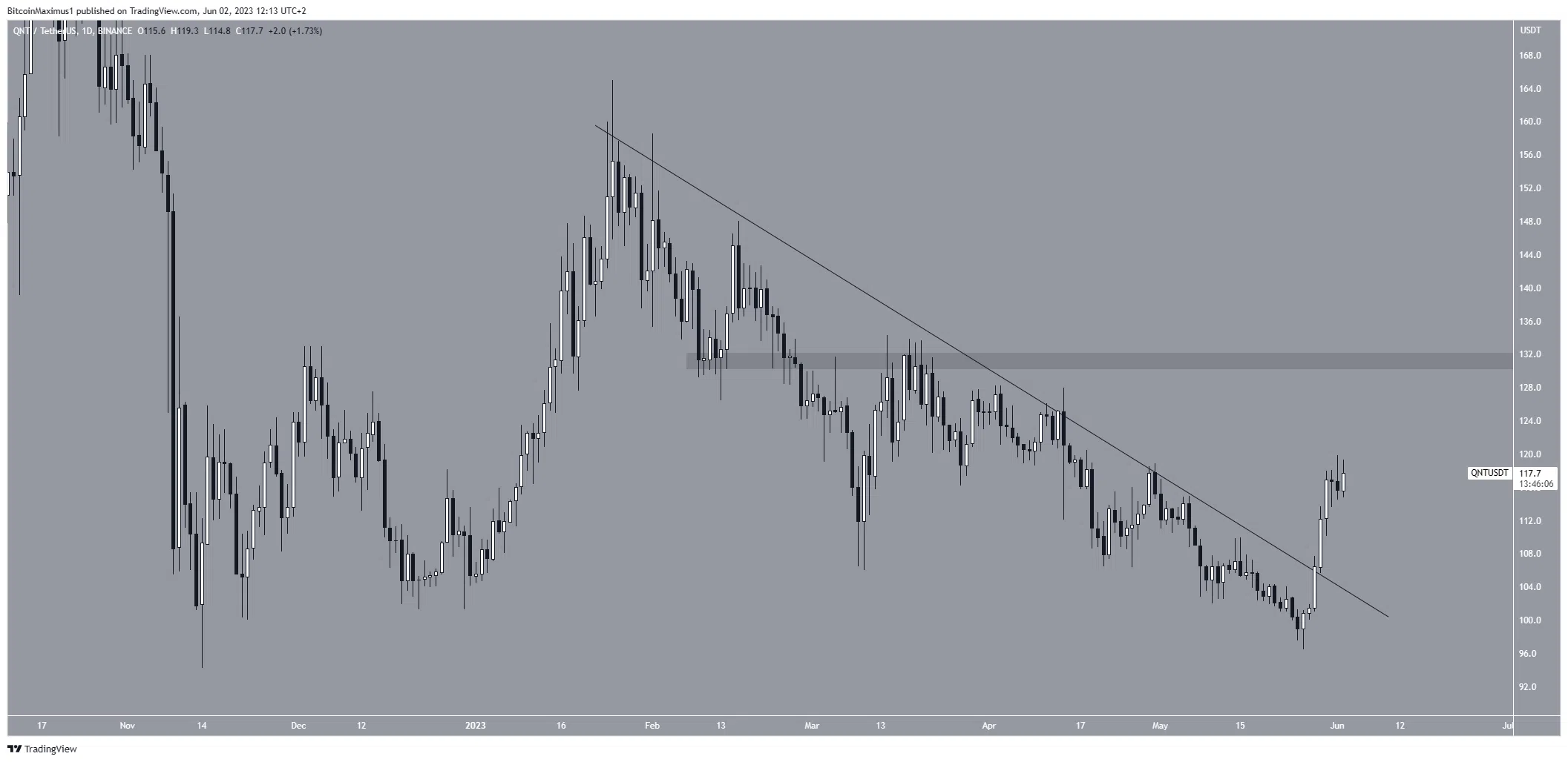 Giá QNT đã giảm xuống dưới đường kháng cự giảm dần kể từ đầu tháng 2. Đợt sụt giảm đã khiến altcoin này chạm đáy tại mốc 96 USD vào tháng 5 năm 2023.