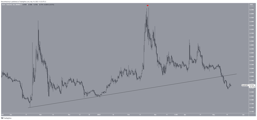Giá KLAY đã giảm kể từ khi đạt mức đỉnh hàng năm là 0.37 USD vào ngày 22/2 (biểu tượng màu đỏ). Trước đó, KLAY đã phá vỡ một đường hỗ trợ tăng dần vào ngày 11/5.