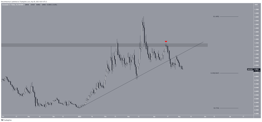 Giá IMX đã giảm kể từ khi bị từ chối bởi vùng kháng cự ngang 1.25 USD (biểu tượng màu đỏ) vào ngày 15/4. Ngay sau đó, IMX tiếp tục phá vỡ đường hỗ trợ tăng dần, cho thấy đợt tăng trước đó đã hoàn tất.