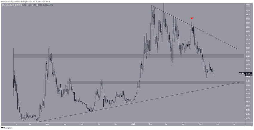 Giá OP đã giảm kể từ khi altcoin này bị từ chối bởi đường kháng cự giảm dần vào ngày 15/4. Chuyển động đi xuống đã dẫn đến mức tạo đáy là 1.48 USD vào ngày 12/5. Mặc dù, OP đã bật lên nhưng vẫn chưa chạm đến vùng hỗ trợ chính ở mức 1.35 USD.