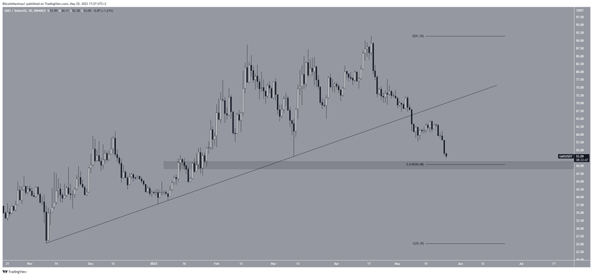 Giá GMX đã giảm kể từ ngày 18/4. Vào ngày 08/5, GMX đã phá vỡ đường hỗ trợ tăng dần đã có từ tháng 11/2022. Sự bứt phá khỏi các cấu trúc dài hạn như vậy thường dẫn đến chuyển động đi xuống rõ rệt.