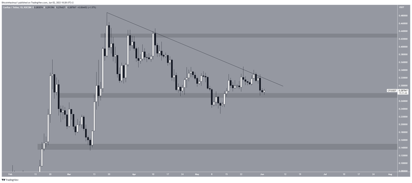 Giá CFX đã giảm xuống dưới đường kháng cự giảm dần kể từ ngày 19/3. Mức giảm dẫn đến mức đáy 0.22 USD vào ngày 12/5. Điều này dường như đã gây ra sự cố từ khu vực nằm ngang 0.27 USD. Tuy nhiên, CFX đã lấy lại khu vực hỗ trợ ngay sau đó và cố gắng thoát ra khỏi khu vực này.