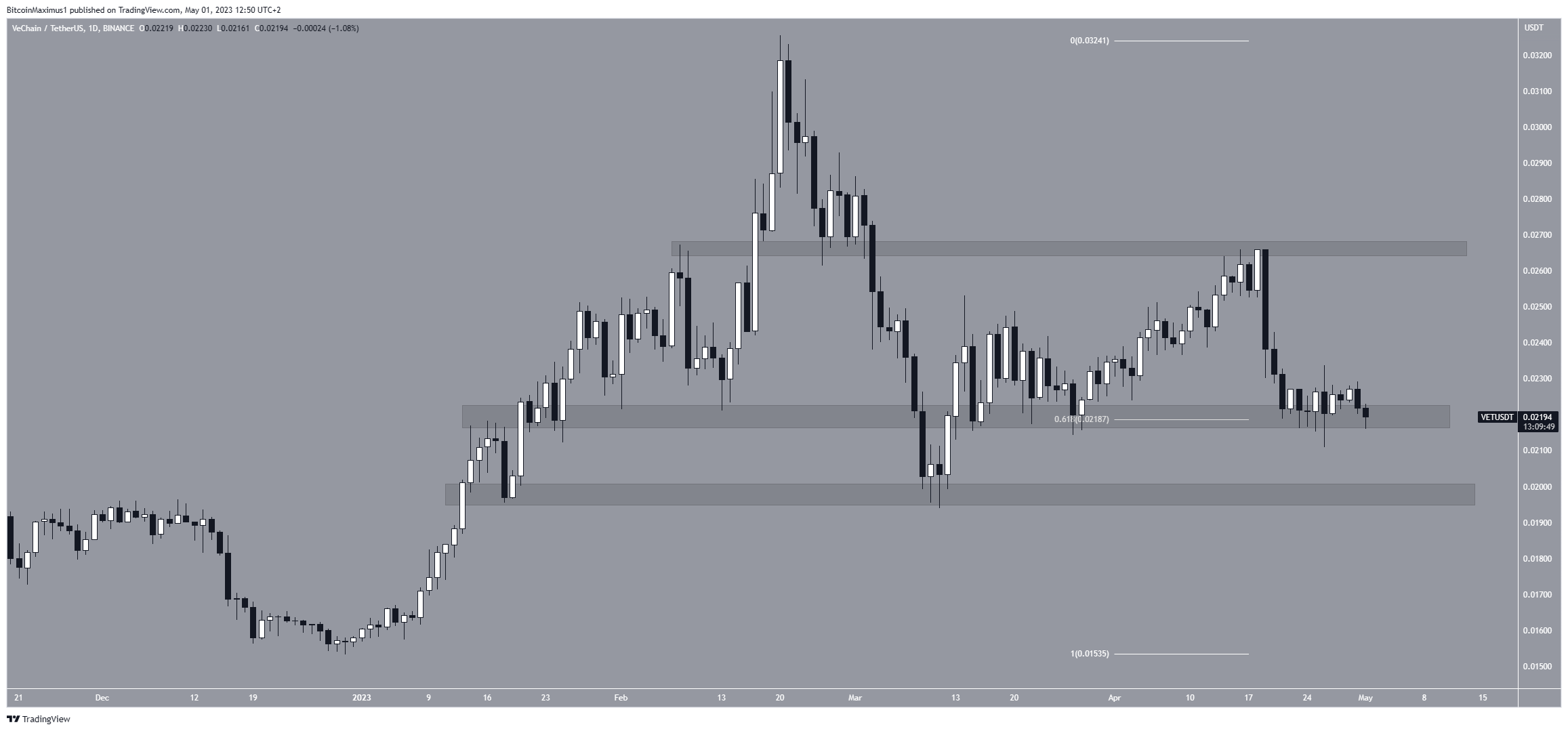 Việc nâng cấp ví di động VechainThor sẽ diễn ra vào ngày 4 tháng 5. Điều này có thể kích hoạt xu hướng tăng cho giá VET, vốn đang gặp khó khăn trong việc bắt đầu một đợt tăng giá từ khu vực hỗ trợ 0.022 USD. Ngoài việc là vùng hỗ trợ ngang, đây còn là mức hỗ trợ thoái lui Fibonacci 06.18 USD.