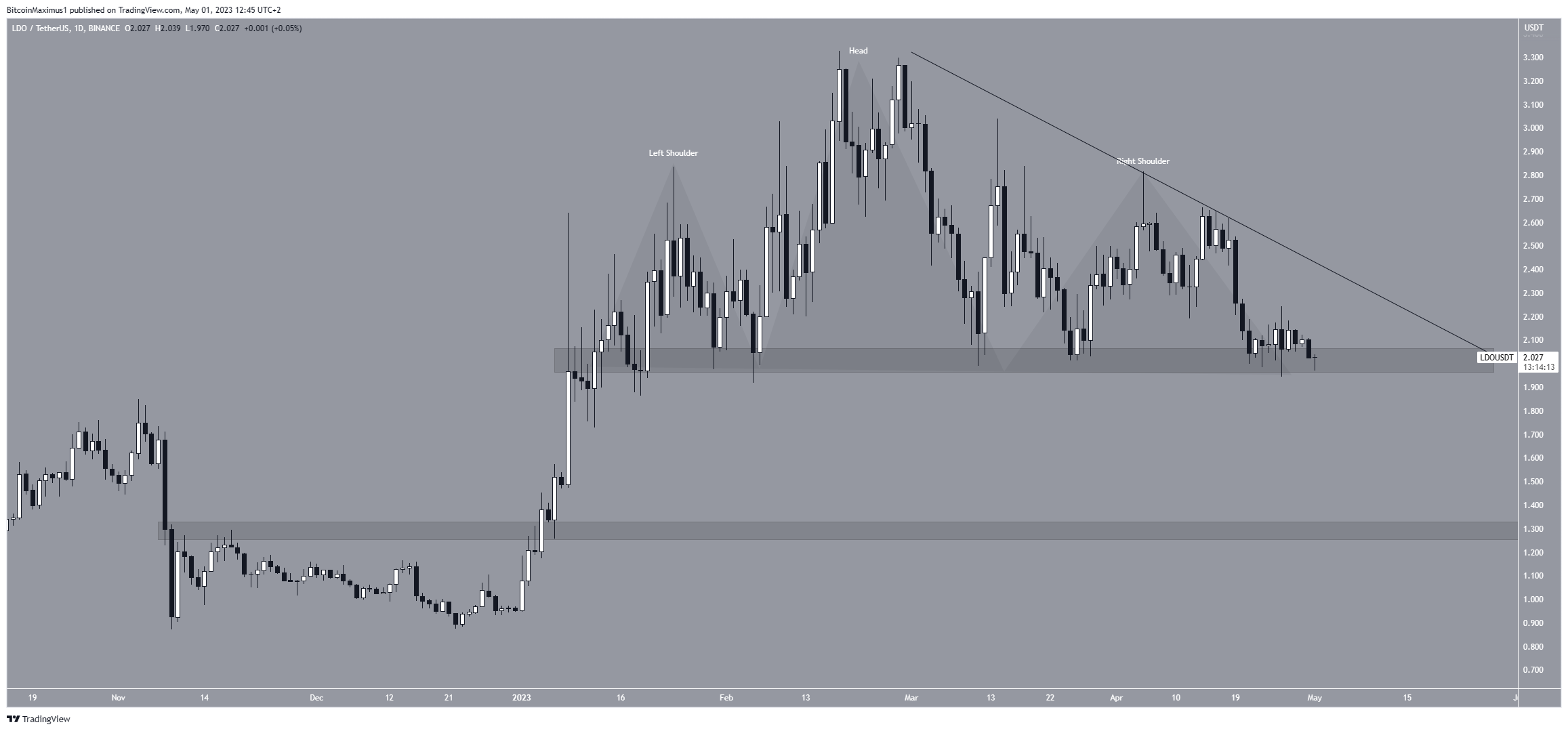 Lido DAO dự kiến sẽ phát hành bản nâng cấp mạng chính mới vào giữa tháng Năm. Mặc dù đây là một sự phát triển tích cực, nhưng hành động giá cho thấy dấu hiệu giảm. Giá LDO đang vật lộn để bắt đầu bật lên tại khu vực hỗ trợ ngang 2 USD. Ngoài ra, nó đã tạo ra mô hình đầu và vai, được coi là một mô hình giảm giá.