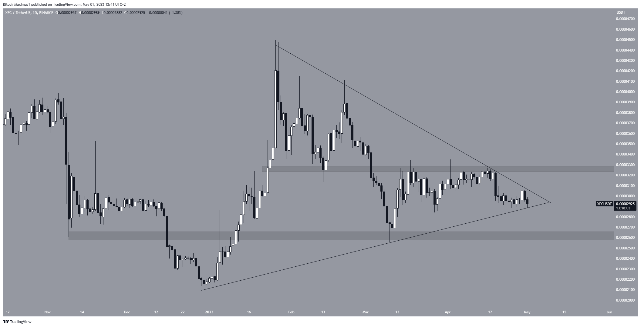 Tương tự như AVAX, giá XEC giao dịch bên trong một tam giác đối xứng được coi là một mô hình trung lập. Nếu nó bị phá vỡ, hỗ trợ gần nhất tiếp theo sẽ là 0.000026 USD. Tuy nhiên, nếu xảy ra đột phá, mức kháng cự tiếp theo sẽ là 0.000033 USD.